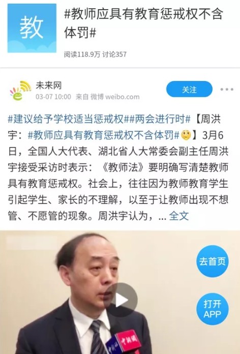 人大代表周洪宇在两会上呼吁,“教师应具有教育惩戒权(不含体罚、辱骂、打骂)”