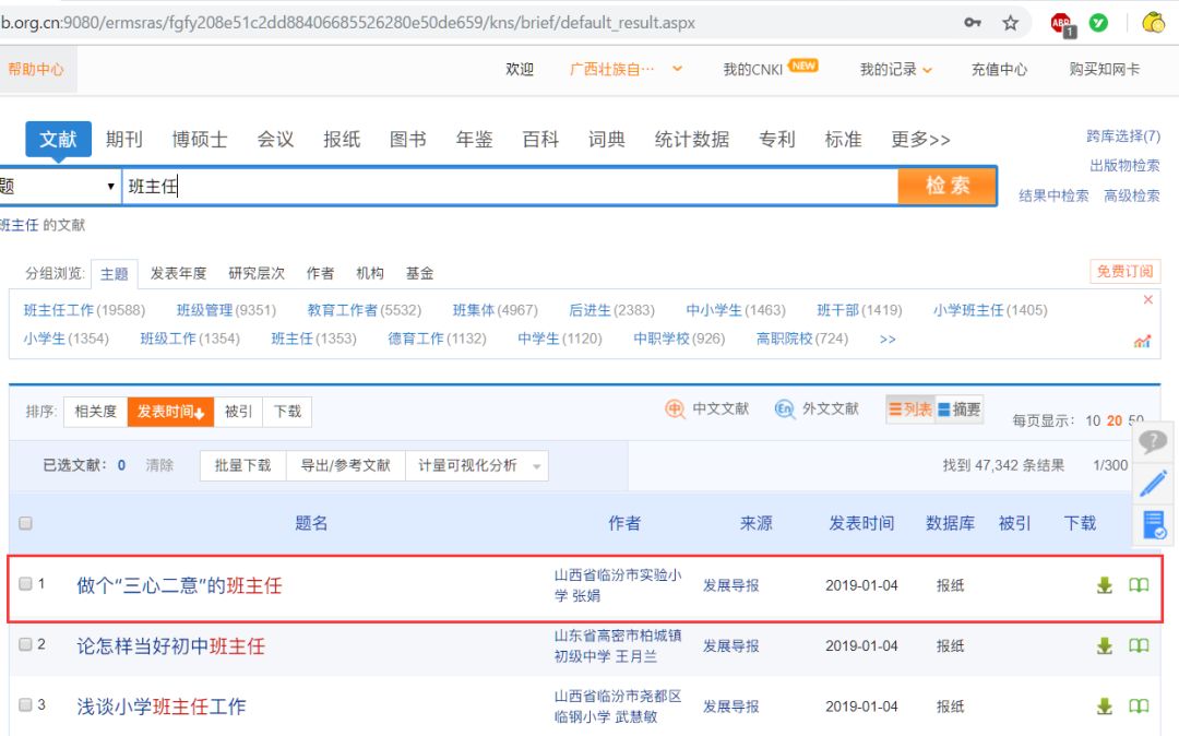 假如,我们想在知网上下载一篇关于“班主任”的论文,搜索出来结果如下: