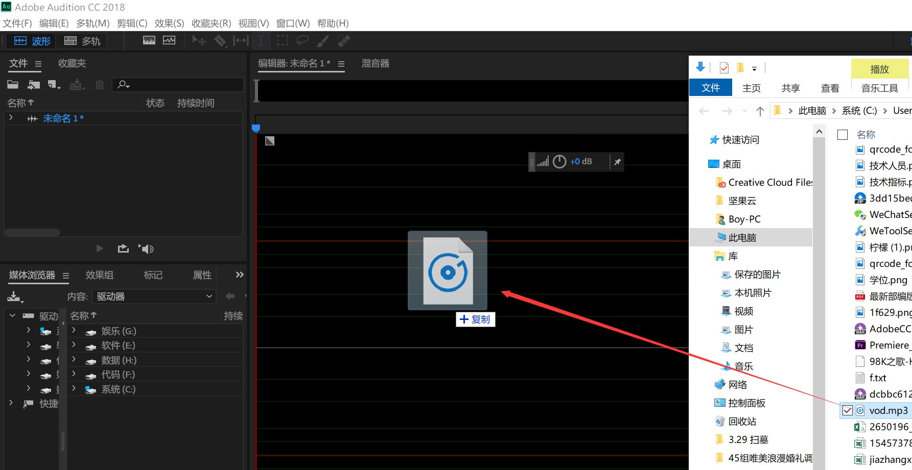 将音频文件,从文件夹中拖到au的窗口界面中。