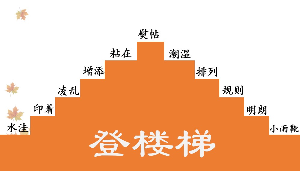 师:难读的词你都会了,那文中这些词语你会认吗?(生答)男生上楼梯,声音一个比一个大。女生下楼梯,声音一个比一个小。