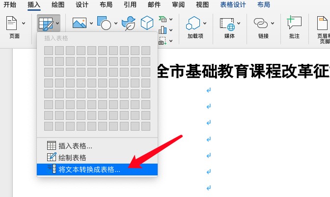 5.在『插入』中选择『表格』下的『将文本转换成表格』