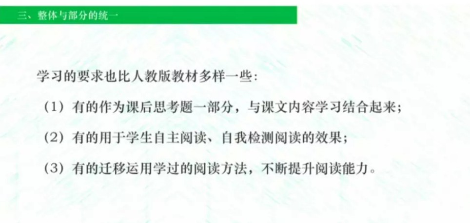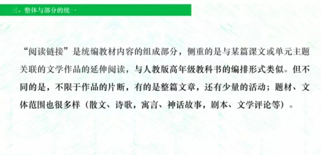 所以学习的要求也比原来的人教版教材又多样一些。那么我们老师在处理阅读链接的时候,要从三个方面考虑,一是“有的作为课后思考题的一部分,与课文内容学习结合起来”。
