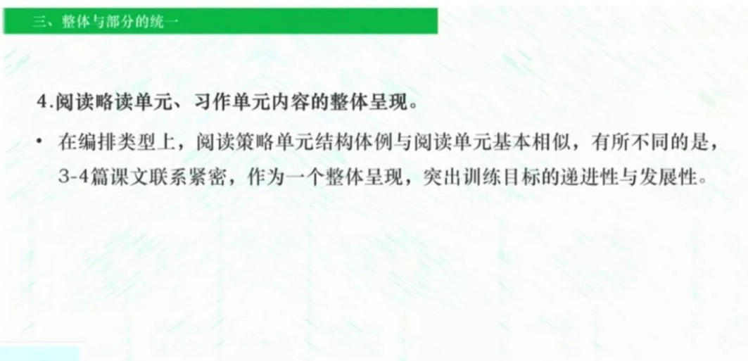 前面讲到,阅读系列、表达系列纵向的层次性、发展性的安排,目标的梯度。那么我们现在回到一个单元内部之间是怎样一种关系。我们前面讲到,单元也是作为一个整体,它虽然是连接的一个部分,但是单元是以单元来组织单元内容的,我们单元各个内部之间又是怎样横向的联系呢?