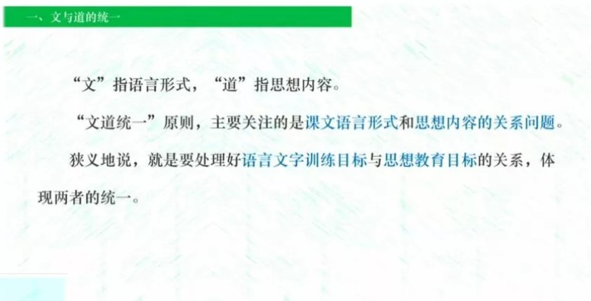 “文”指语言形式,“道”指思想内容。“文道统一”原则,主要关注的是课文语言形式和思想内容的关系。狭义地说,就是要处理好语言文字训练目标和思想教育目标的关系,体现两者统一。这个关系在不同的历史时期,都是从一个阶段走向另一阶段。