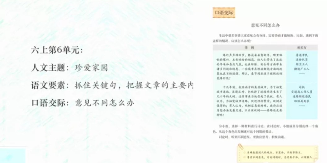 比如说六年级上册第六单元。人文主题是珍爱家园;语文要素是抓住关键句,把握文章主要内容;口语交际是意见不同怎么办。这个口语交际和语文要素和人文主题没什么关联,它是相对独立体系,它以功能交际为主线。
