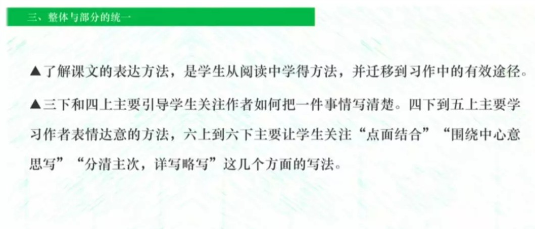 张志公先生经常强调教学引导学生走一个来回,一个来回一个就是理解内容,第二个就是学习文章的表达方法。那么从了解文章表达方法来看教材的安排,比如说三下和四上主要引导学生关注作者如何把一件事写清楚,要求非常低。四下、五上主要学习作者表情达意的方法,四年级下册慢慢向高年级过渡了。六上和六下让学生关注“点面结合”“围绕中心意思写”“分清主次,详写略写”,我们不提“详略得当”,就是重要的部分详写,次要的部分简要写一写,从这样几个方面来安排内容。