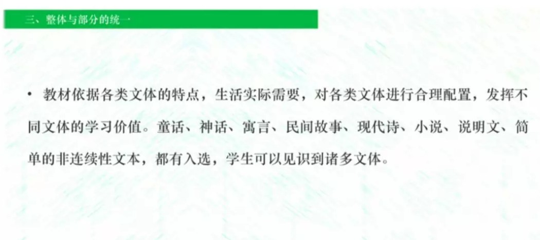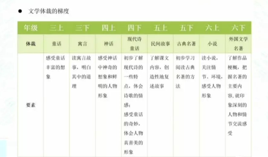 那么讲到文学体裁的时候,这套教材文学作品非常非常多,有一条主线也体现了梯度。比如说我们三上“感受童话丰富的想象”,三下“读寓言故事,明白其中的道理”,四上“感受神话中神奇的想象和鲜明的人物形象”,四下光是文学作品组成的单元就有两个,一个是现代诗,一个是神话。