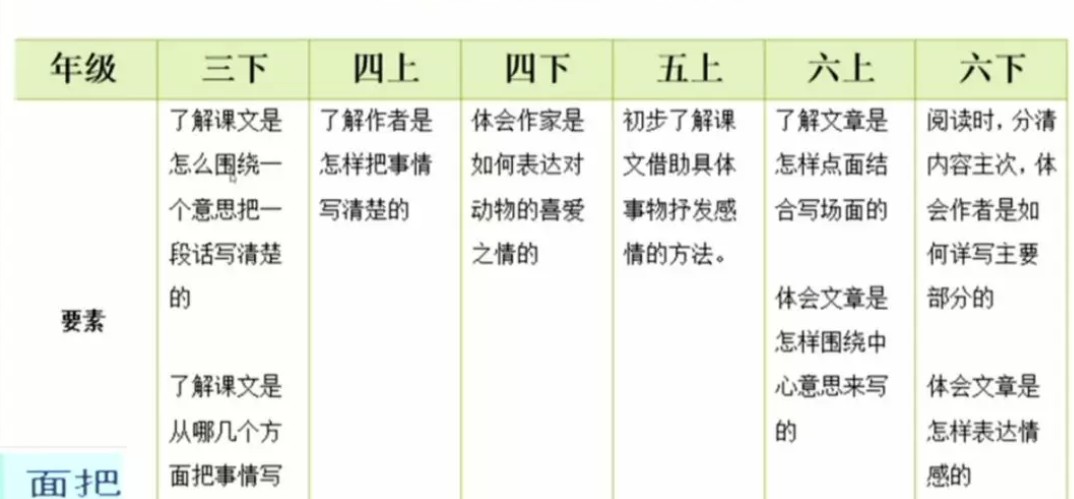 比如说我们三年级下册中“了解课文是怎么围绕一个意思把一段话写清楚的”,是阅读中了解文章的表达方法;“了解课文是从哪几个方面把事情写清楚的”,告诉我们一件事可以从几个方面写;四上“了解作者是怎样把事情写清楚的”,要求围绕一个意思把一件事写清楚,这是表达方面的一个要求。