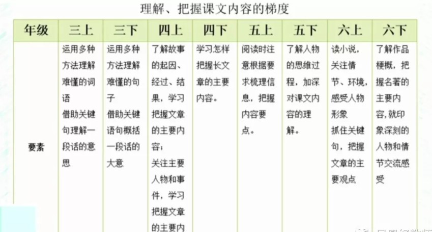 老师们可以看一看,这是我们统编教材三到六年级关于理解把握课文的梯度。