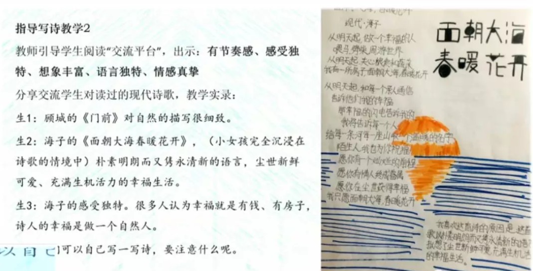 我们再看这个,这节课我当时印象非常深。这也是一个老师指导写诗,他先从“交流平台”入手,他把“交流平台”提到的关于诗歌的特点让孩子自己来说。这时候他就开始让孩子交流自己读了哪些诗,因为这个单元有一个小的中心学习,安排了学生在课外读诗。但是这个诗我也没读过,孩子的阅读面非常非常广,后来听完课我赶紧回单位,我把顾城的这首诗找出来读一读,不然人家讲起来,老师自己都没读过。我对这个小女孩的印象至今很深,她对海子这首诗的解读,我们一般的老师包括我个人都是解读不到位的,她的语言真的都是很诗化的,我都有记录的,“尘世新鲜,朴素明朗而又隽永清新的语言”。《面朝大海,春暖花开》就是很神韵的,诗歌最大的特点就是神韵。另外一个孩子马上又说,“海子的感受独特”。