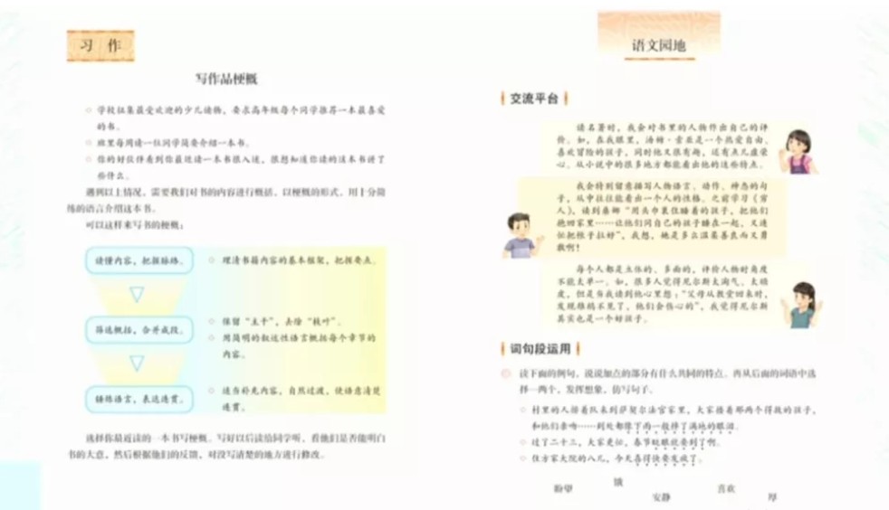到了六年级还有一个要求,就是推进文学作品的阅读或者是外国文学作品的阅读。大家都比较关注外国文学作品的创作者而对外国文学作品的译者不大关注。我们这次编外国文学作品的时候发现同一个文学作品不同的译者翻译差别很大,我们在词句段栏目里有一个目的就是要关注外国文学作品的译者,增强译者意识,特别是现在很多绘本,根本没有关注译者。