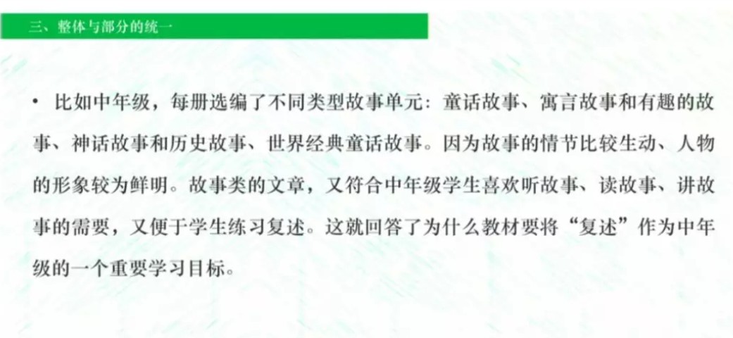 为什么安排这么多童话故事呢?我们在中年级开始有一个主要的训练点叫“复述”,故事类的情节一般比较生动,人物形象又比较鲜明,孩子们感兴趣。通过把孩子的阅读兴趣和孩子的阅读需求结合起来,主要的目的是让孩子练复述。因为三年级有详细复述,四年级有简要复述。为什么现在的孩子喜欢?因为我们有很多的故事。另外比如说我们三年级上册有童话故事,四年级下册有世界经典童话故事,老师问为什么中年级有两个故事?其实三年级上册的童话故事是让学生了解童话的特点是“想象丰富”,四年级下册是让学生“了解童话故事人物的真善美”。