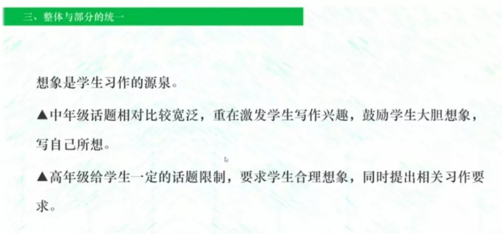 因为从中年级开始,我们让学生观察,写景一定要观察,不观察景物是写不出来的。在中年级打下了留心观察的习惯的基础上,我们要求学生开始写景,结合“搜集资料”“描写景物变化”“按照一定的顺序写”等写景要求。从这里可以看出来,能力之间是互通的,我们运用以前养成的习惯,运用以前培养的能力来进行后面内容的学习,包括阅读的、包括表达的,这就是我前面讲的目标的层次性和发展性,教材编写的系统性,一步步地往上提升。