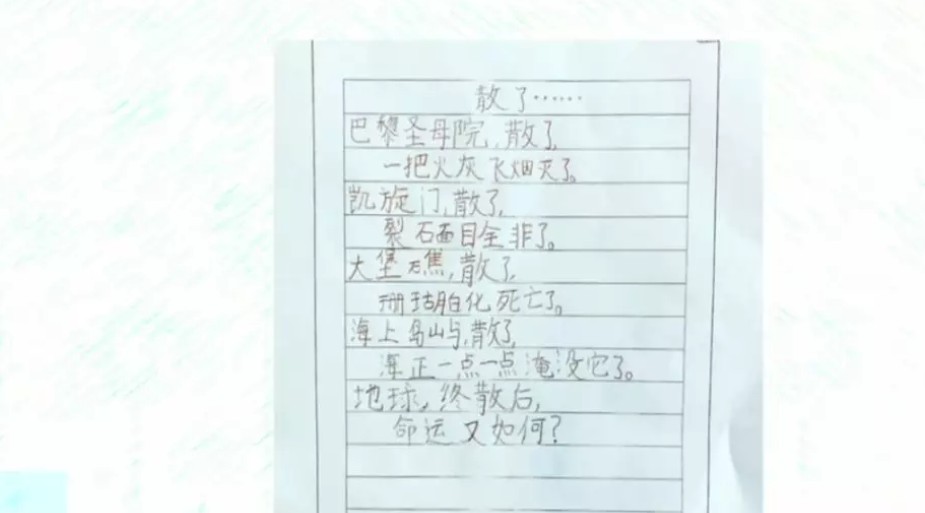 第一个孩子上台了,是流着泪在读这首诗,流着泪,真的很有感情,所以我们语文老师有时候教得好,孩子就学得好,怎么教就怎么学。这首诗正好写在巴黎圣母院刚烧的那几天,他不是仅仅讲巴黎圣母院,他讲到珊瑚礁,讲到岛屿,最后讲到地球人物的命运,这就是诗,诗就讲究哲理,讲究神韵。