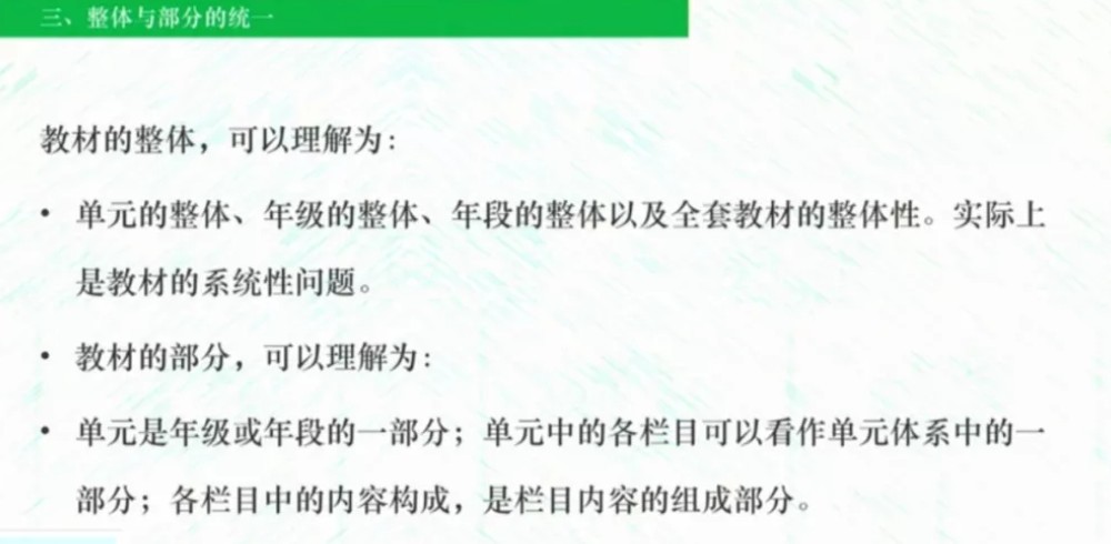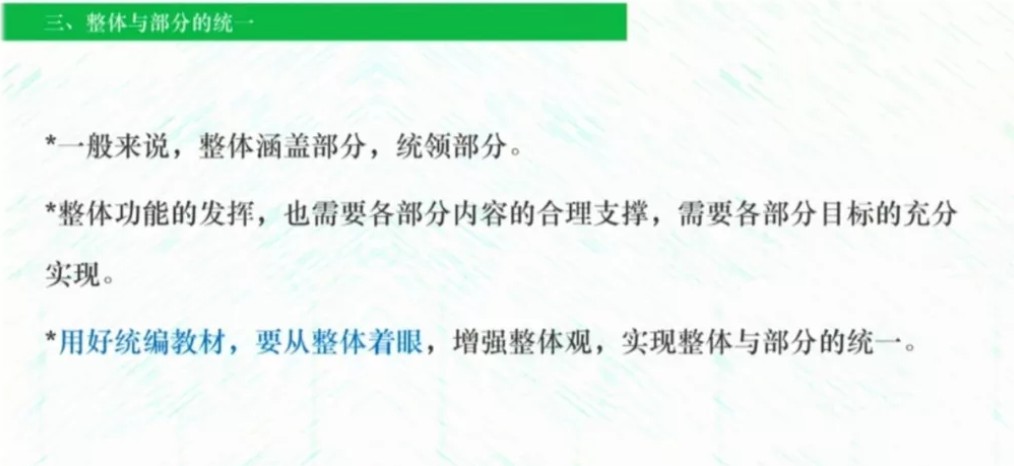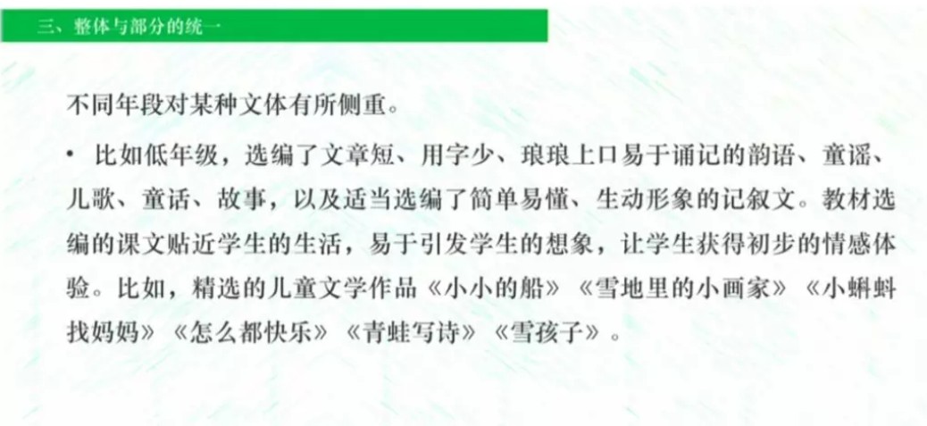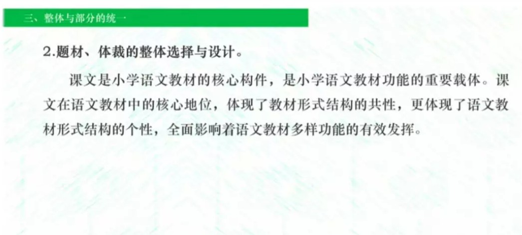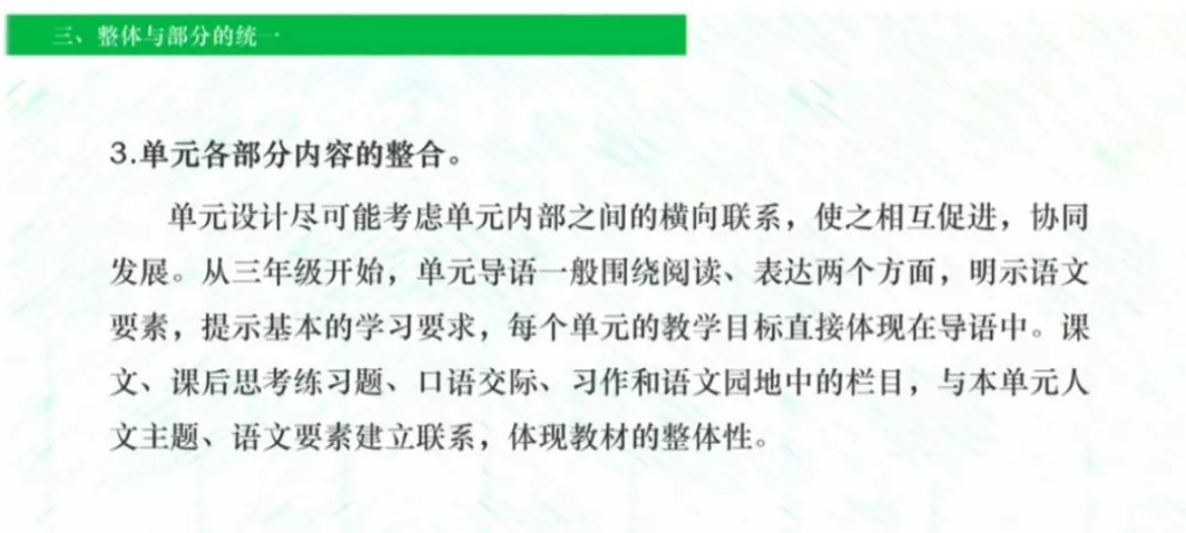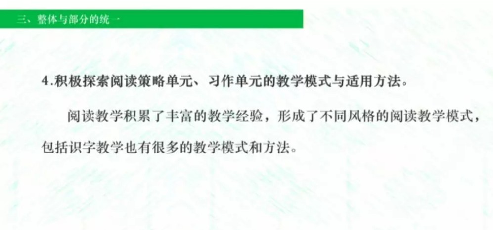 关于整体与部分的统一需要注意的问题,这些理论性的东西我就滑过去了,其实多年来我们语文教学存在的问题就是整体性没有把握好,特别是上一些示范课,基本看不到让一个孩子从头到尾来很好地把文章多读几遍。这就是我们讲的从整体入手。