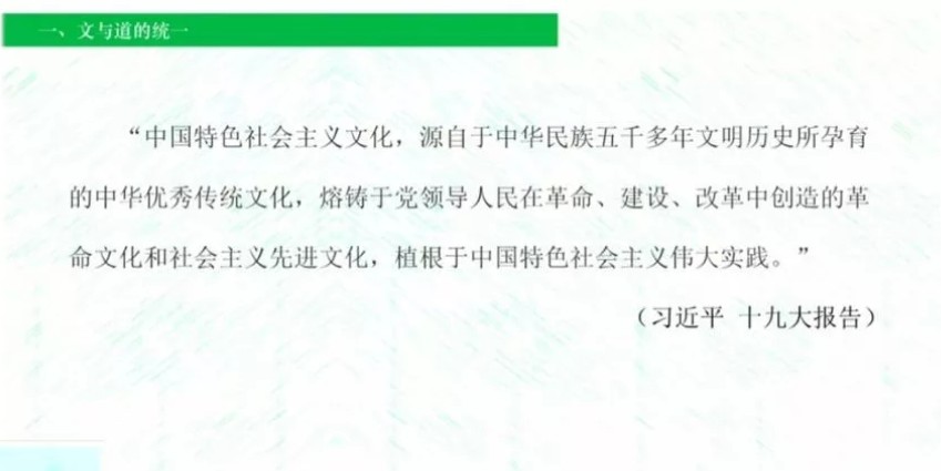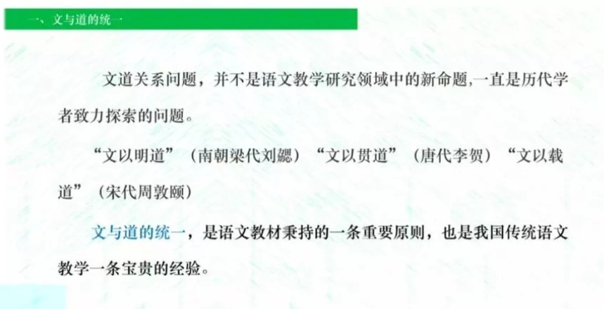 今天讲的第一方面,是文与道的统一。文与道的关系问题,不是语文教学研究领域中的新命题,一直是历代学者致力探索的问题。文与道的统一,是语文教材秉持的一条重要原则,也是我国传统语文教学一条宝贵的经验。