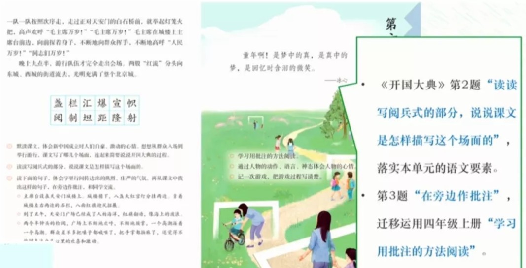 再看第三课《开国大典》。《开国大典》第2题“读读写阅兵式的部分,说说课文是怎样描写这个场面的”,第3题,“在旁边作批注”,迁移运用四年级上册“学习用批注的方法阅读”。也就是说四年级让孩子学习批注,六年级就学习运用。