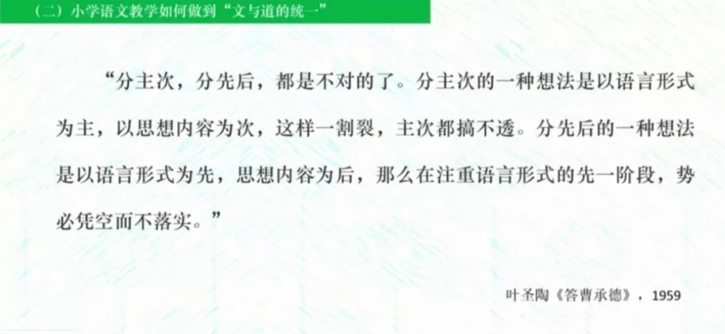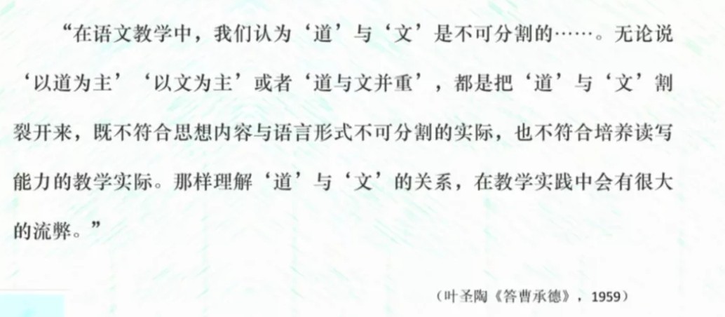 “分主次,分先后都是不对的了。分主次的一种想法是以语言形式为主,以思想内容为次,这样一割裂,主次都搞不透。分先后的一种想法是以语言形式为先,思想内容为后,那么注重语言形式的先一阶段,势必凭空而不落实。”叶老这一段话应该作为我们处理好“文”与“道”关系的指导思想。