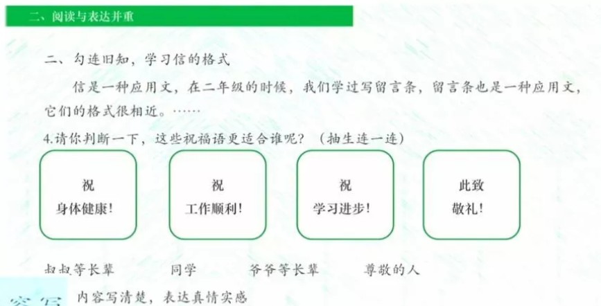 其实书信、留言条、日记和其他的一些应用文,它的格式是不一样的,我们强调连接什么?另外现在,老师(在课堂最后)问(学生):请你判断一下,这些祝福语更适合谁呢?老师们看一看它写信的四个对象,四种不同的祝福语,然后老师就要求学生用线连一连,这是一个知识性的错误。我们写信反而出现知识性的错误。