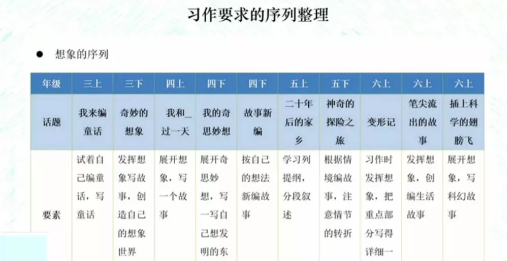 三年级下册我们就提出让学生试着自己编童话、写童话,下册就是发挥想象写故事,创造自己的想象世界。中年级基本上是大胆想象,不对想象提出一些要求。到了高年级就可以有一些话题了,比如说五下的“根据一些情境来想象”,到了六年级就提出一些合理的想象,因为科幻的想象需要有一定的合理性,不是随便大胆想就可以想的,就像科学要带有一些合理的成分,所以我们要不断提高对想象的要求。想象类作文的这一条线是非常清楚的。