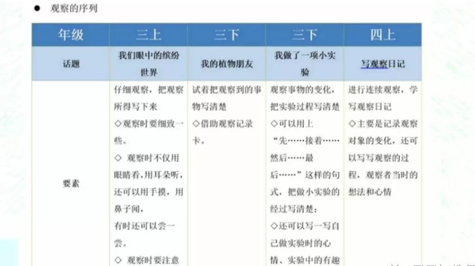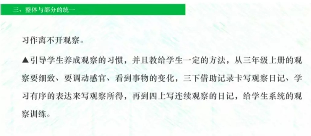 这是课程标准提出的要求,为什么要提出这个要求?学生在写作文的时候往往没有话可说,没有东西可写,他平时不注意留心,不注意观察,不注意发现,那么教材要引导学生养成观察的习惯,并且教给学生一定的方法,比如从三年级上册开始,引导观察要细致、要调动感官、要看到事情的变化。观察不一定要用眼睛看,还可以用耳朵听,用嘴巴尝一尝,包括用心去感受,这都是观察。所以我们在三年级上册有一个习作单元就叫“细致观察”,要看到事情变化。到了三年级下册开始,我们就要写观察日记,有记录卡。四年级上册我们还有一个单元叫“连续观察”。