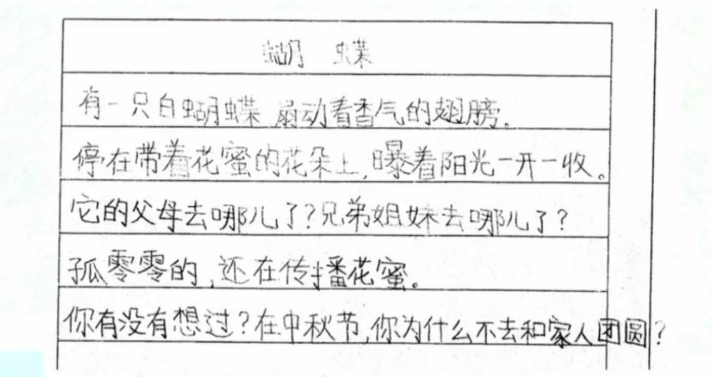 还有这个,我问小女孩为什么是“香气的翅膀”?“因为蝴蝶不断采花粉,把翅膀沾染了,翅膀带着香气。”她不仅仅讲蝴蝶,她想到的是她的思考,诗就要讲自己的思考,人生的感悟,作者独特的感受。