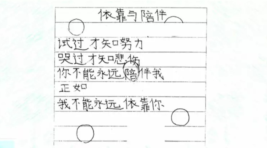 最后,我们女老师以为这是一首爱情诗,《依靠与陪伴》的确很像爱情诗。后来我让那个小男孩说一下情况,他说这是他和他妈妈去孤儿院看到孤儿的时候,他内心的一些想法。
