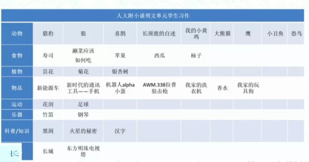 我们看一下课例,这是人大附小的说明文单元。从题材入手,这个班的学生在这一个单元选的是不重复的话题,一个说明文可以写这么多的话题,很多都是我们老师包括我个人不太熟悉的话题,包括机器人、火星的秘密,这是我们老师根本想不到的。