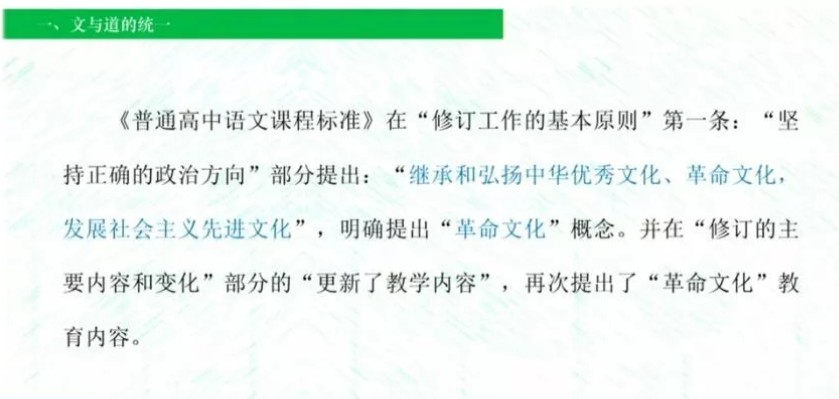 那么现在讲一讲革命文化。过去我们提的是革命传统题材的选篇,包括苏教版、人教版都讲革命传统文化,现在我们都讲革命文化。革命文化是从十九大报告中提炼出来的,这次修订的《普通高中语文课程标准》明确将革命文化在课程标准中提了出来。我想这次修订的义务教育的语文课程标准肯定要把革命文化作为一个重要的指导思想。《普通高中语文课程标准》在“修订工作的基本原则”第一条就提出了“坚持正确的政治方向”,我估计义务教育课程标准的第一条也会是“坚持正确的政治方向”。“继承和弘扬中华优秀文化、革命文化,发展社会主义先进文化”,这是高中语文课程标准提出的概念,这个概念就是从党的十九大报告中提炼出来的,明确提出了“革命文化”概念。并在“修订的主要内容和变化”的部分“更新了教学内容”,再次提出了“革命文化”教育内容。