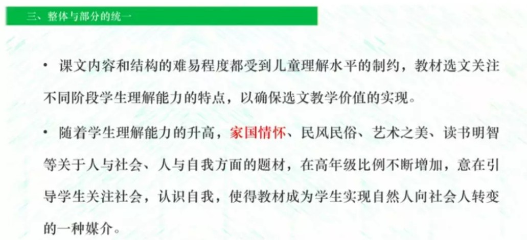 这是我们语文教学的一个指导思想——怎样引导学生由关注自我向关注社会的过渡,这也是我们心理学上儿童行为的社会化——由自然人向社会人的转变。现在有人提出,为什么我们不可以在家里辅导啊?我在家里也可以把孩子带大啊!但是我们忽略了人是社会的组成部分,我们要通过学校的教育,通过学校这个集体完成由一个自然人向社会人的转变,要认识社会。这是我们语文教育的另外一个功能,这个功能通过选文,通过人文主题引导,体现了语文教学既有工具性也有人文性。