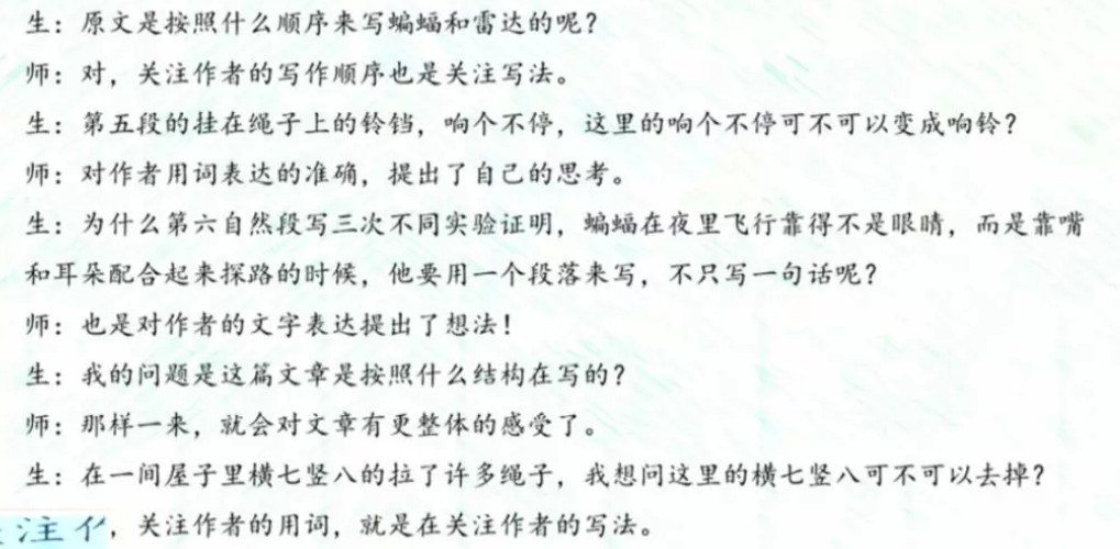 关于不同的角度提问,教材已经有示范了。我课后问老师:“你在想什么,在上课吗?你已经试教了那么多次了。”我跟他说,当第一个孩子提出冒号可不可以去掉的时候,首先要鼓励他,千万不要顺着他。一个问题提出来就顺一个,这堂课上得我就非常累。最后我发现好几个孩子提的不是真问题,最后有一段话让孩子实施提问,有一个女孩子说:“我没有吃过马铃薯和藕”,我当时很震惊,“四年级孩子在中国没有吃过马铃薯和藕?”我现在听课有一个特点,不看老师,我问学生。我首先问学生是怎么想的,为什么提出这个问题。因为马铃薯和土豆有些地方方言不一样,我大概心里有数了。我就问问学生,“土豆吃过吗?”“吃过。”“为什么这么提呢?”孩子脸都红了。就是老师教学过程根本不考虑孩子,完全顺着孩子鼓励鼓励,一节课上下来,如果这么上下去,这个单元就上毁了。当孩子说冒号可不可以去掉的时候,你要想着我们批注的两个问题的角度。首先要鼓励孩子动脑筋了,然后再回到课文,示范提问。你看,课文中我们给了问题,你看那个批注,孩子一下子就知道了,要根据内容提问,根据方法和表达的方法来提问,你不能整个环节都纠结在这个标点符号上面,都纠结“响铃”变成“铃铛”。老师上课真的要关注学生,而不是沉浸在自己的想象中。这一点要怎么改变?实际上从教学论说,要关注主体和主导的问题。