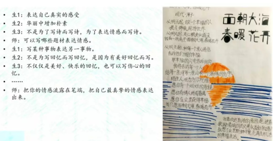 其实我们引导孩子过程中真的能体会,有时候我们老师管得太多,但是我们老师也不能随着学生完全地放,我们讲“放收怎么有度”,这是我们老师教学机制的问题,也是一个教学水平的问题。我觉得这个老师“放收”真的非常好。“很多人认为幸福就是有钱、有房子、诗人的幸福是做一个自然人”,解读得多好。老师说:“我们也可以自己写一写诗。”一般的老师就让孩子写了,但是他没有让孩子开始写,他说:“要注意什么呢?”简单一点拨,孩子又来交流了,“表达自己真实的感受”“华丽中增加朴素”“不是为了写诗而写诗,为了表达情感而写诗”。我这些记录都是孩子的真实语言,慢慢孩子就认识到写诗的一些特点。老师不是让孩子无限制谈下去,两三个谈完以后,他接着又转:“可以写哪些题材?”学生回答“可以写某一种事物表达另一种事物”“不是为了写回忆而写回忆,是因为有美好回忆而写”,慢慢孩子就进入诗歌的境界了。我特别喜欢这个孩子,他说“不仅仅是美好、快乐的回忆,也可以写伤心的回忆”,画龙点睛!这时候老师说:“把你的情感流露在笔端,把自己最真挚的情感表达出来。”