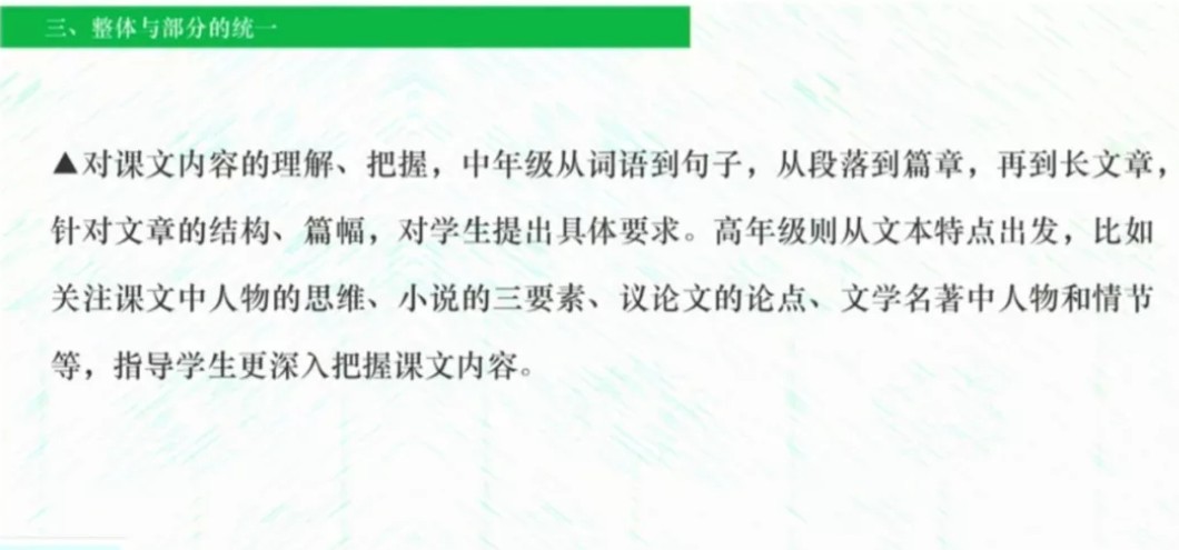 对课文内容的理解、把握,中年级从词语到句子,从段落到篇章,再到长文章。我们这套教材把原来高龄段的一些阅读的要求和表达的要求往后移到高年级,把低龄段的移到三年级。