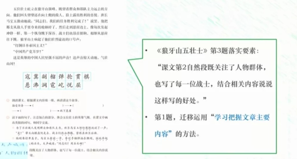 这是《狼牙山五壮士》,这是本单元的第二篇课文。这篇课文第3题落实要素:课文第2自然段既关注了人物群体,也写了每一位战士,结合相关内容说说这样写的好处。这道题的目的就是体会文章怎样做到点面结合的,但是不是所有的都出这样的题目,所以我们第1题:根据提示讲讲这个故事,这个题目的编排目的是学习把握文章主要内容的方法,也是运用以前学到的。