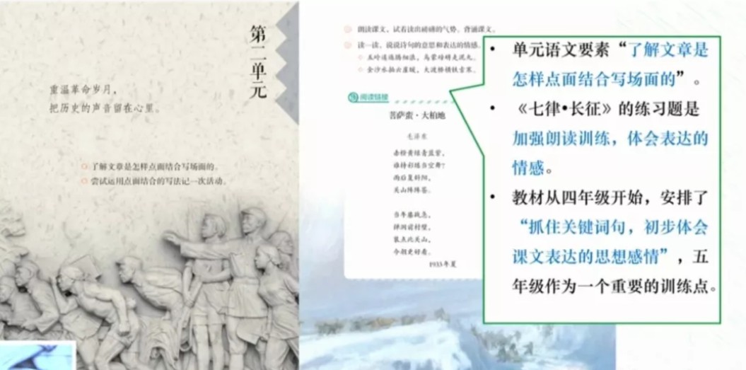第一篇课文是毛主席的《七律·长征》,因为诗歌是很难体现点面结合这样一个阅读要素,所以我们这一课就提出了一个这样的题目:加强朗读训练,体会表达的情感。就是说说诗句的意思和表达的情感,读一读。