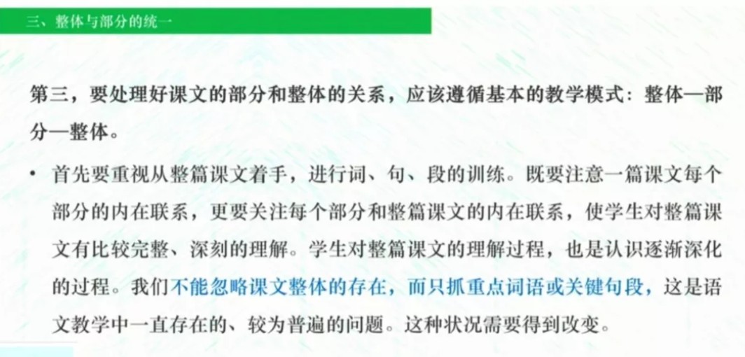 “整体-部分-整体”的模式是92年的大纲明确提出的语文教学模式,这样的语文教学模式在今天依然有很重要的参考价值。
