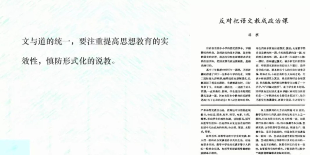 最后就是洛寒在1961年在《人民日报》上发表的一篇文章《反对把语文教成政治课》,这个思想在当今也有现实意义。文与道的统一,要注重提高思想教育的实效性,慎防形式化的说教。