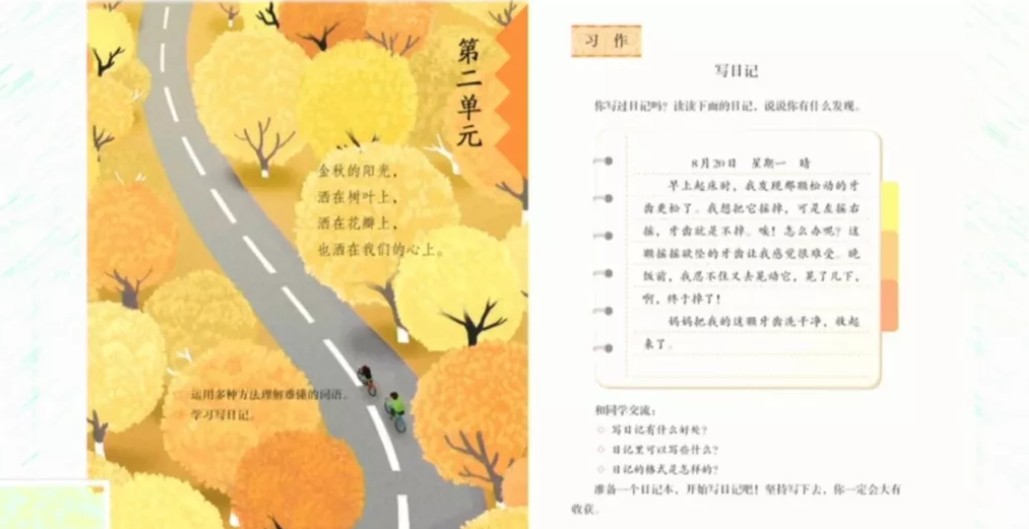 那么这一类的单元,一般的口语交际与习作都有自己的独立体系,比如说三年级上册第二单元是讲秋天的景色的,我们的习作就安排了写日记。