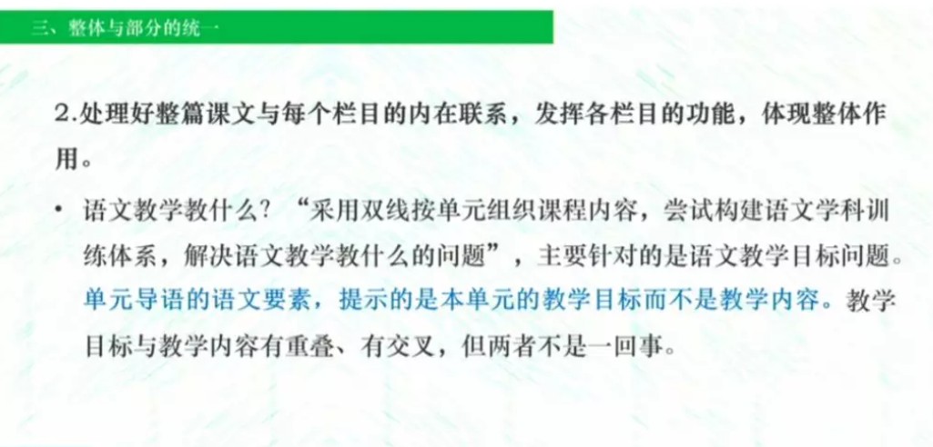 我们现在还回到一个最原始的问题——语文教学教什么?教材采用双线按单元组织课程内容,常识构建语文学科训练体系,解决语文教学教什么的问题,主要针对的是语文教学的目标问题。单元导语的语文要素提示的是本单元的教学目标而不是教学内容,我指的是语文要素。教学目标与教学内容有交叉、有重叠,但不是一回事。