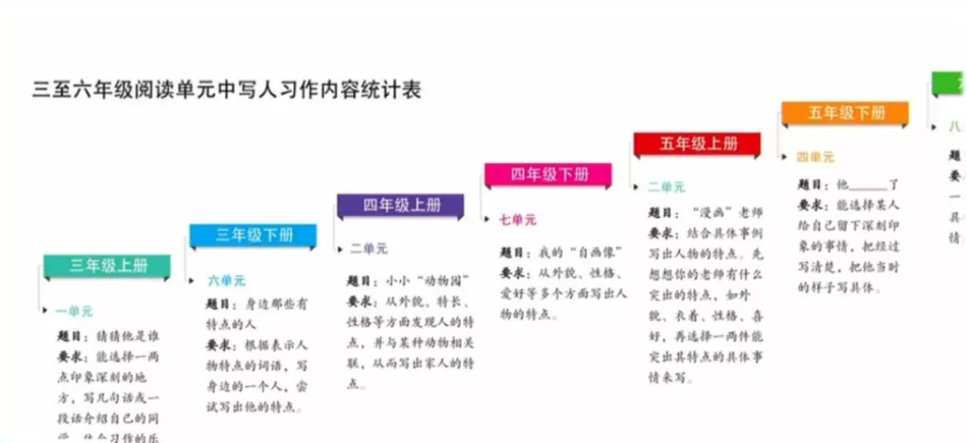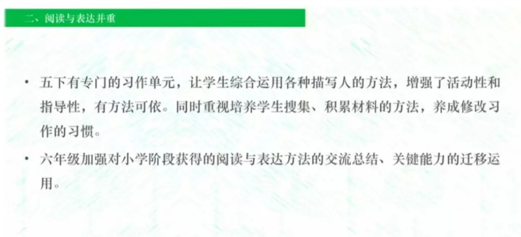 五年级下册还有一个专门写人的习作单元,所以六年级我们在习作的安排上主要强调的是阅读和表达方法的迁移。