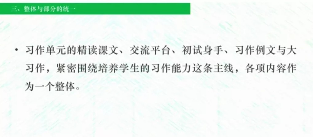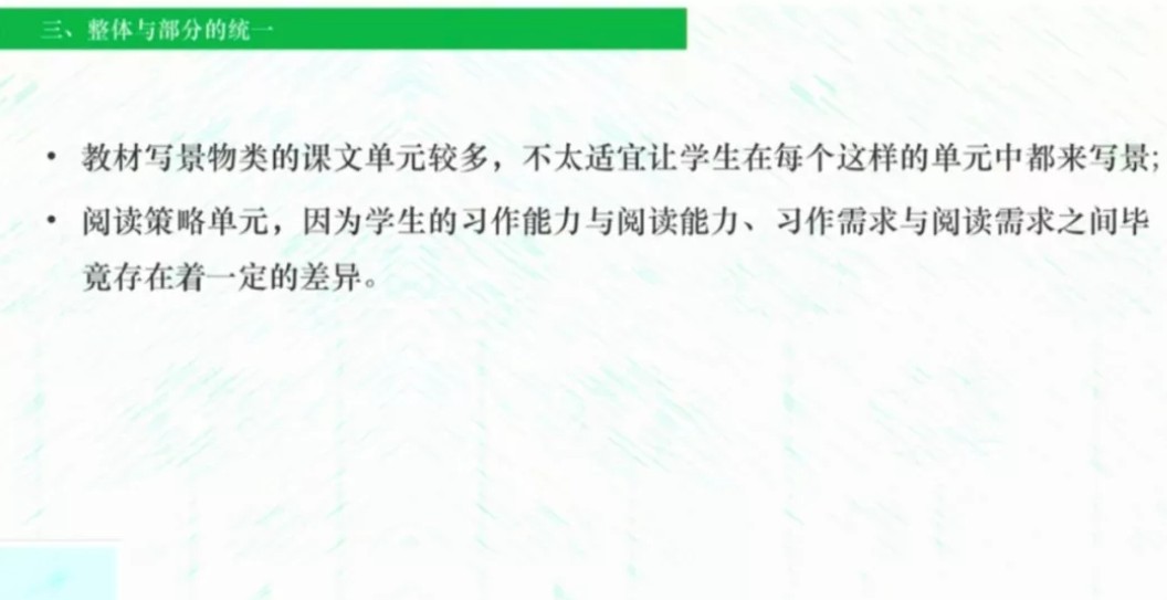 我也听过一些老师的教学课例,他到最后才让学生来说我们今天要的作文要写什么,他就是没有把这个单元的编排意图理解透,我们这个是一个整体。我们的精读课文也好,交流平台也好,都是为了我们写作文服务的,这是一个和原来的习作教学,和原来的阅读教学最大的不同之处。我们的教师如何在教学过程中加强整体性,我前面说了,没有好的参考的模式。