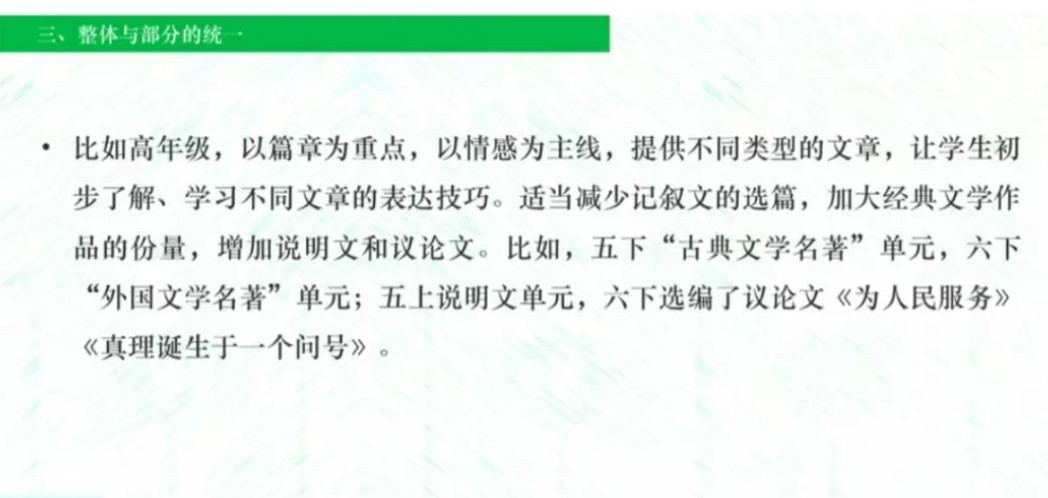 学习文章的表达技巧是非常非常难的,所以我们把目标定位在初步了解一下,初步学习,没有提到运用。文学作品的技巧是非常难的,我们学习、了解一下,适当减少记叙文的选篇,加大经典文学作品的分量,增加说明文和议论文。五年级下册我们有“古典文学名著”单元,六年级下册有“外国文学名著”单元,五年级上册有“说明”单元,六年级下册有议论文——《为人民服务》《真理诞生于一个问号》。