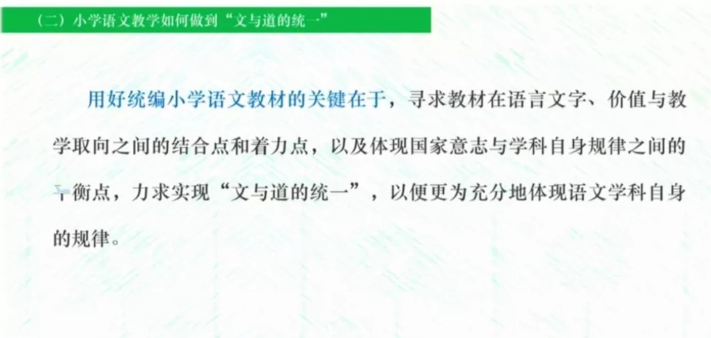 关于小学语文教学如何做到“文与道的统一”。简单谈谈这一问题。用好统编小学语文教材的关键在于,寻求教材在语言文字、价值与教学取向之间的结合点和着力点,以及体现国家意志与学科自身规律之间的平衡点,力求实现“文与道的统一”,以便更为充分地体现语文学科自身的规律。就是语文课的思想教育如何落实。
