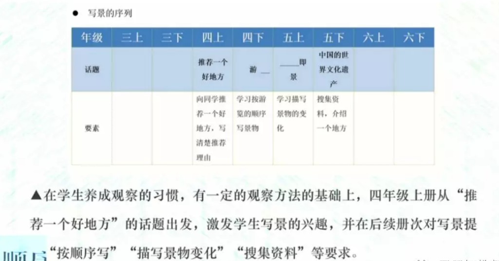 另外,我们讲写作文,写事、写景、状物,这是我们经常写的内容。其实,写景也是孩子比较头痛的一种作文题型,在四年级、五年级这两个年级我们安排了写景。