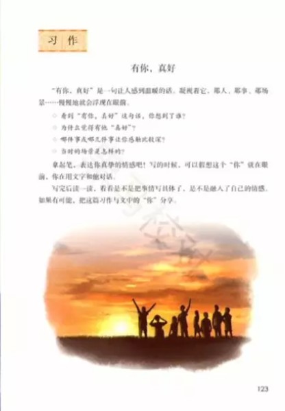 这是六年级上册第八单元的习作课,老师们手里都有教材,叫《有你,真好》,这个课是准备拍录像课的,放在教师教学用书里。