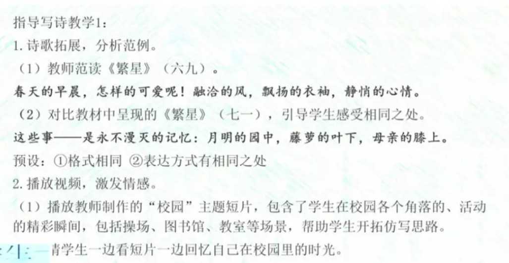 这是两首现代诗,我们江苏还有一个很重要的任务,就是下半年要拍现代诗的教学课,要上两课。两所学校的课我都听了,写实。这个老师从方法入手,首先提供范文,这个是老师找的,这个是我们教材中的。他说格式相同,表达方式有相同之处。从范文入手是第一个,然后是创设情境,然后开始写。基本上我们老师是这么一个流程。