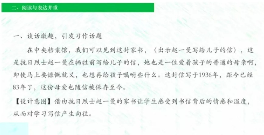 但是我们讲,写信有一个基本的范式,赵一曼给孩子的家书是民国时期的书写格式,它都是竖排,为什么孩子茫然?第一,赵一曼家书格式和现在教材提供的书信格式不一样。第二,孩子不知道赵一曼是什么人。所以老师、省里市里的学校花了很多很多功夫来研究这封信,其实我感觉问题复杂了,其实问题很简单。现在的语文教学,老师们感觉统编教材应该好教,但是有时候把简单问题复杂化了。