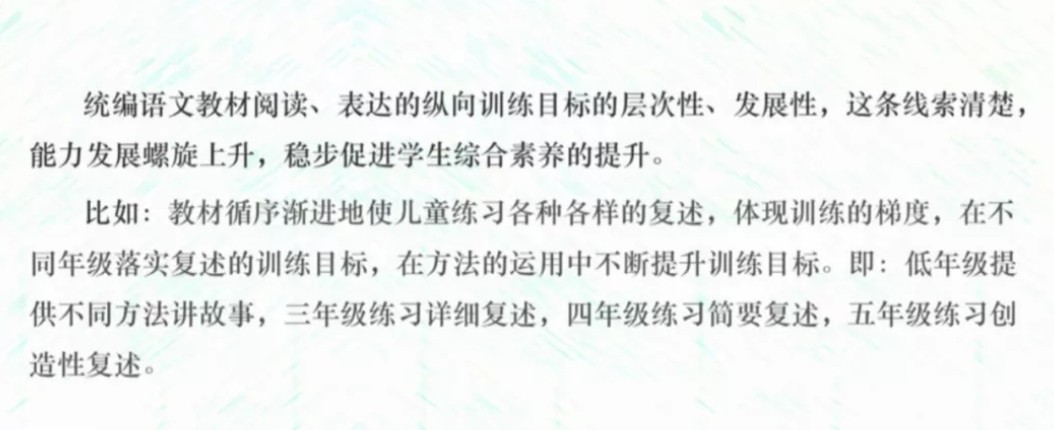统编语文教材 ,表达的纵向训练目标的层次性、发展性,这条线索清楚,能力发展螺旋上升,稳步促进学生综合素养的提升。