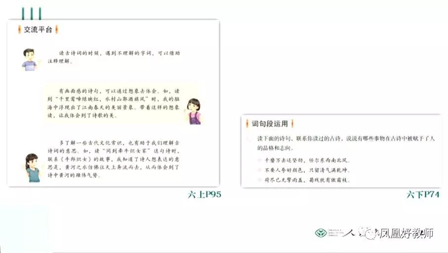 比方六年级上册这个“交流平台”里面,有画面感的诗句可以通过想象去体会。多了解一些文化常识,也有助于我们理解古诗词的意思。学生借助注释去理解,然后他自己发挥想象去体会情感,这些都是我们学习古诗的好办法。我们希望通过交流平台的形式,给学生一些提示、一些梳理。