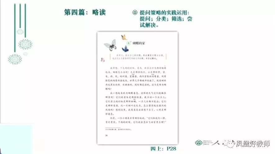这整个单元,我觉得是引导学生能够通过提问的方式来理解课文,所以阅读策略本身也是为了促进理解课文的。其中我们教学的时候,可能比较难处理的一件事就是怎么样把这个方法策略的学习跟课文的理解有机地整合在一起,这个可能是我们老师要去探索的。